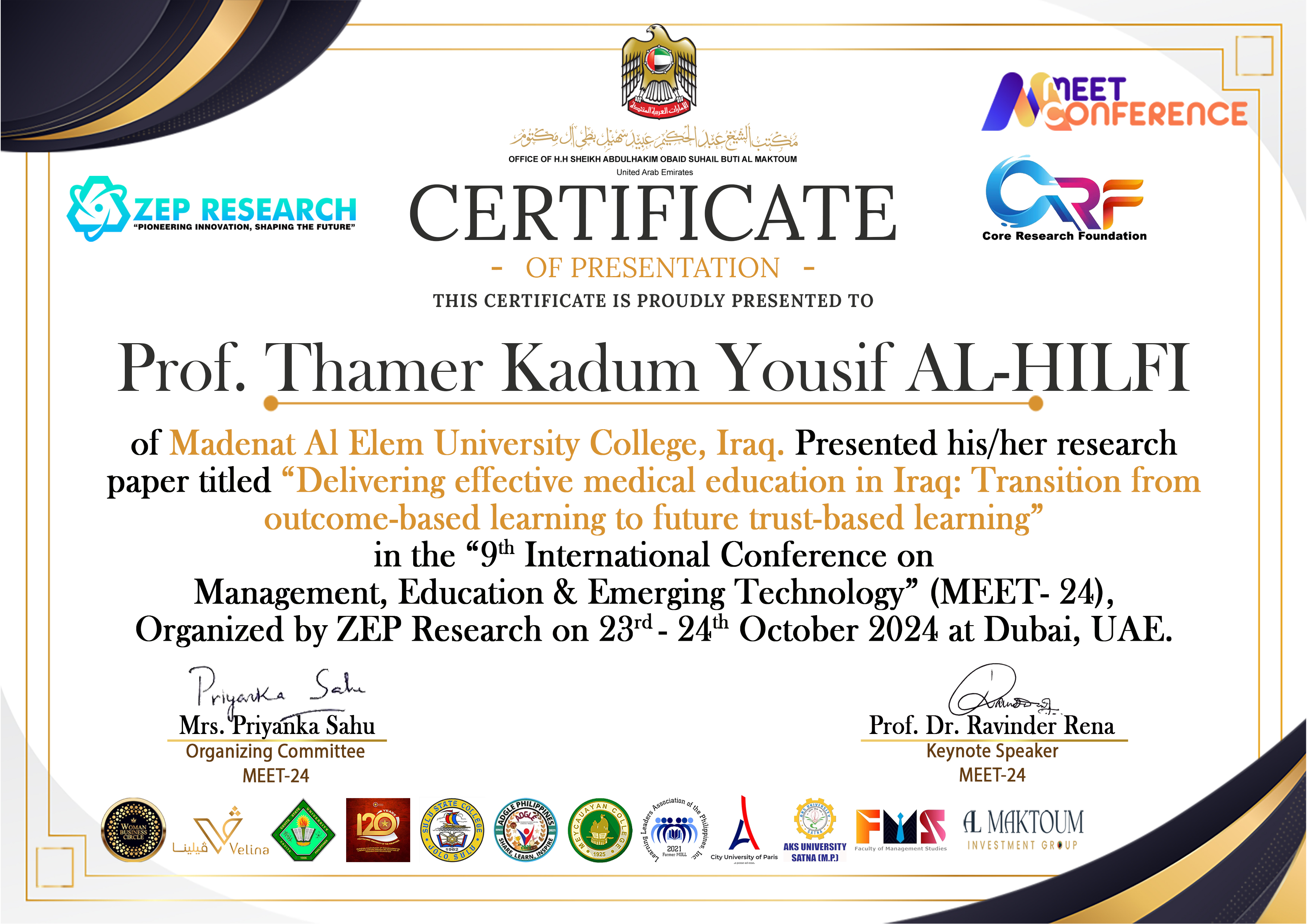 شارك الاستاذ الدكتور ثامر الحلفي التدريسي في كلية مدينة العلم الجامعة في المؤتمر العالمي التاسع في دبي وتحت شعار (التكامل في التعليم والادارة الناجحة باستخدام التكنلوجيا الحديثة)، من خلال بحثه الموسوم (التأثير الايجابي للمناهج الصحية والطبية الحديثة في بناء قدرات الخريجين)