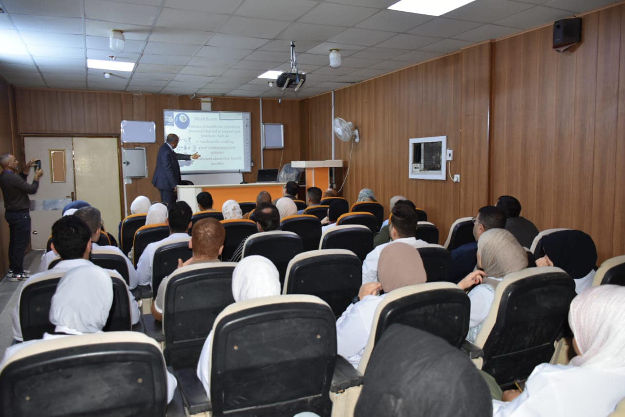 حيث قدم الدكتور سعد محاضرة علمية وبحضور مدير واطباء وصيادلة المستشفى عن الأخطاء الطبية وأسباب حدوثها والطرق الناجعة لتلافيها وتقليل آثارها وكيفية التعامل معها