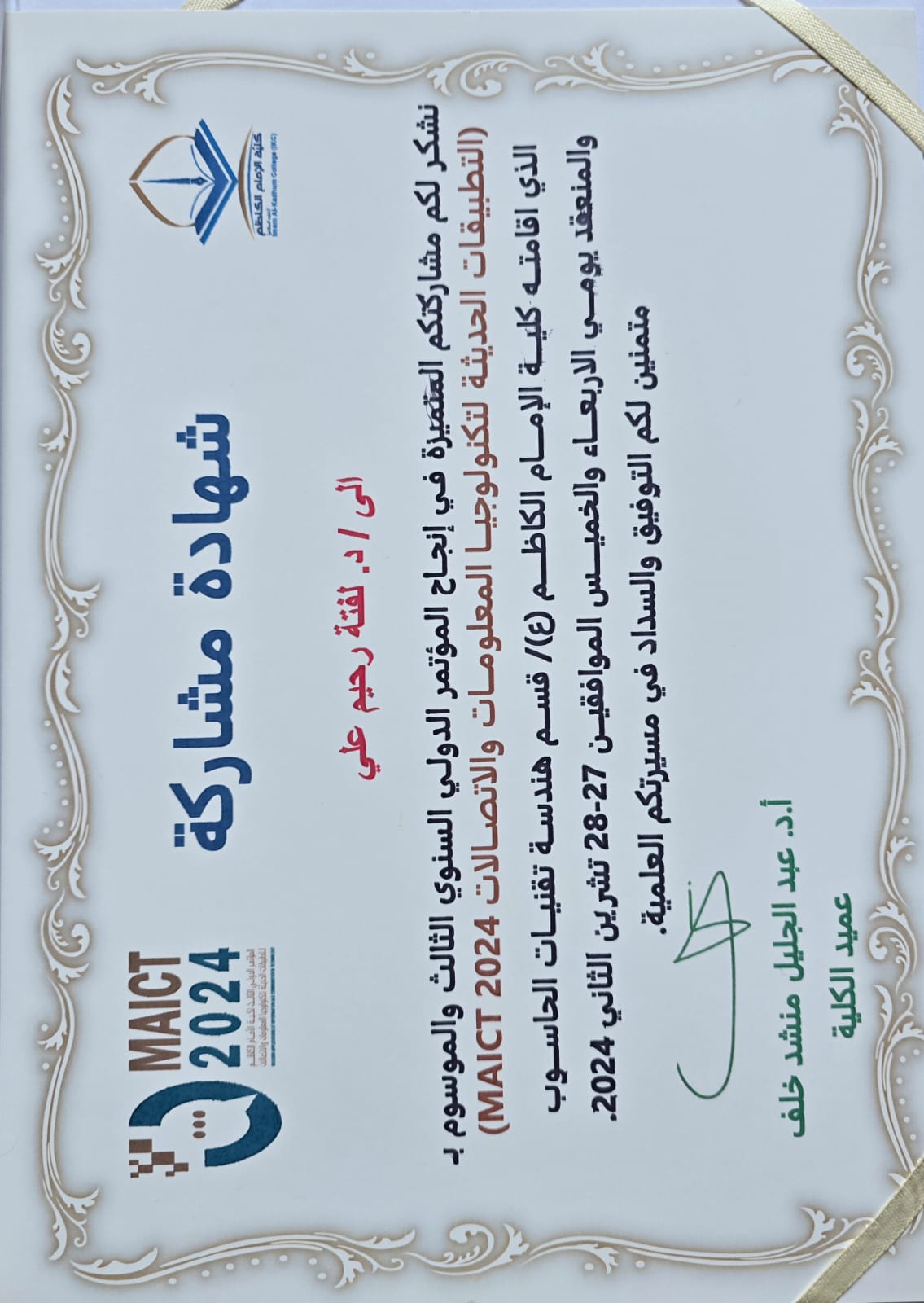 شارك الدكتور لفتة رحيم علي رئيس قسم هندسة تقنيات الحاسوب في كلية مدينة العلم الجامعة في المؤتمر الدولي الثالث الموسوم الموسوم بـ ( التطبيقات الحديثة لتكنولوجيا المعلومات والاتصالات ) الذي أقامته كلية الإمام الكاظم(عليهاالسلام) /قسم هندسة تقنيات الحاسوب في قاعة اتحاد الصناعات العراقية وبالتعاون مع كلية الهندسة / جامعة البصرة وكلية التربية / الجامعة المستنصرية وكلية علوم الحاسبات وتكنولوجيا المعلومات/ جامعة القادسية وجامعة الإمام جعفر الصادق(ع) وبمشاركة أكاديمية واسعة من مختلف الجامعات وعدد من الباحثين في مجال التخصص
