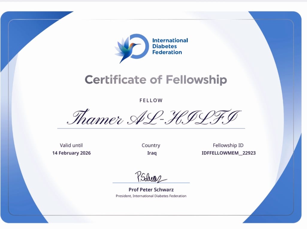 منح الاتحاد الدولي للسيطرة على مرض السكر الأستاذ الدكتور ثامر الحلفي التدريسي في كلية مدينة العلم الحامعة شهادة الزمالة تقديرًا لمساهماته الفاعلة في برامج السيطرة على مرض السكري في العراق والمنطقة. يُعتبر هذا التكريم اعترافًا بجهوده الكبيرة في مجال مكافحة هذا المرض المزمن، والذي يشكل تحديًا صحيًا كبيرًا في العديد من الدول، بما في ذلك العراق.