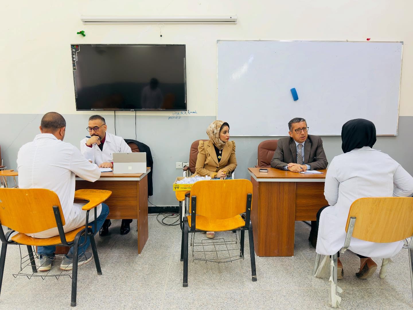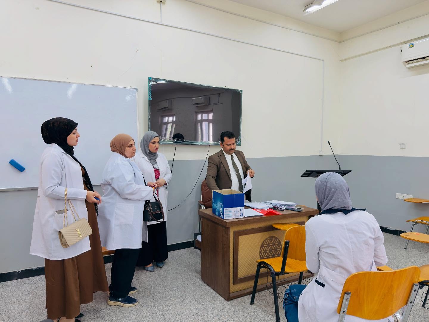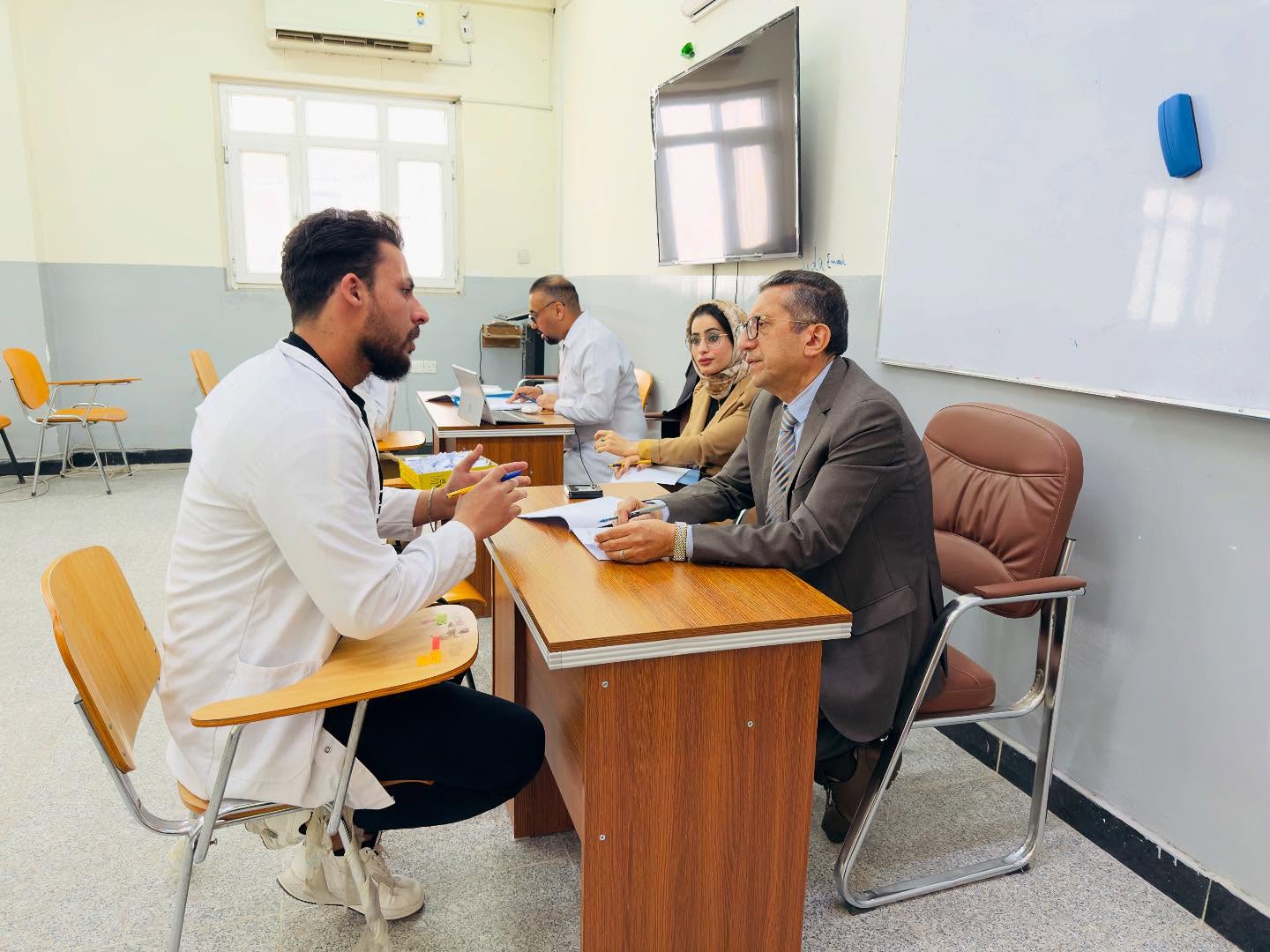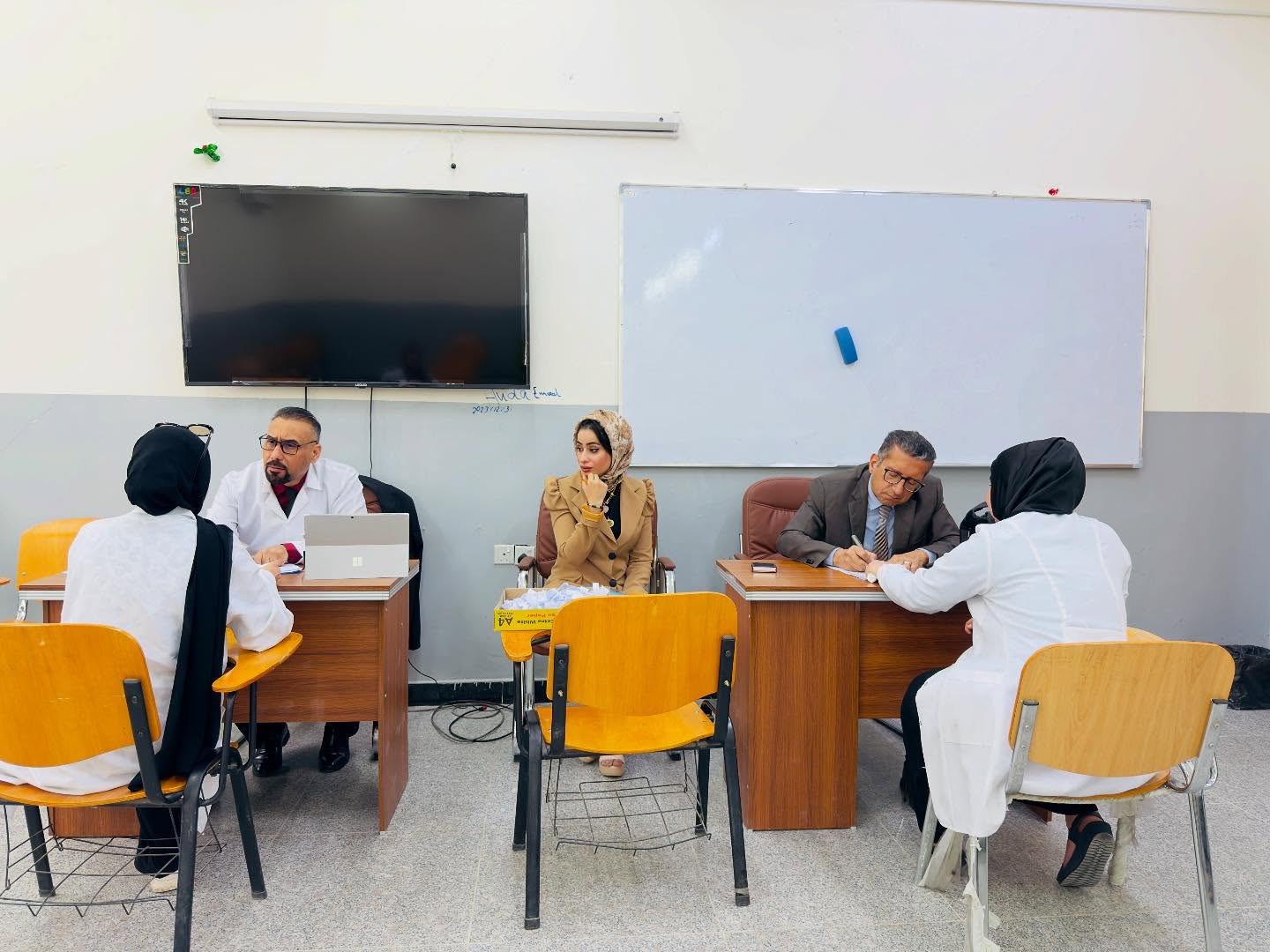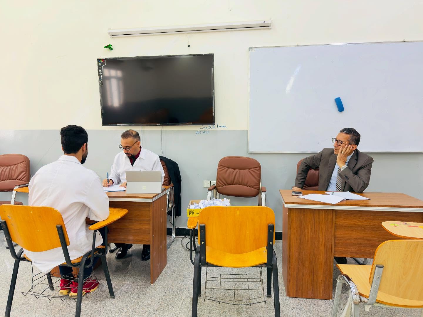 تم اليوم إجراء امتحان تقويمي عملي نهائي لطلبة المرحلة الرابعة في مادة صحة مجتمع حيث تضمن الامتحان تشكيل اكثر من لجنة اختبار ضم اساتذة القسم من اختصاص المادة وفي مقدمتهم الاستاذ الدكتور ثامر الحلفي معاون العميد للشوون العلمية
